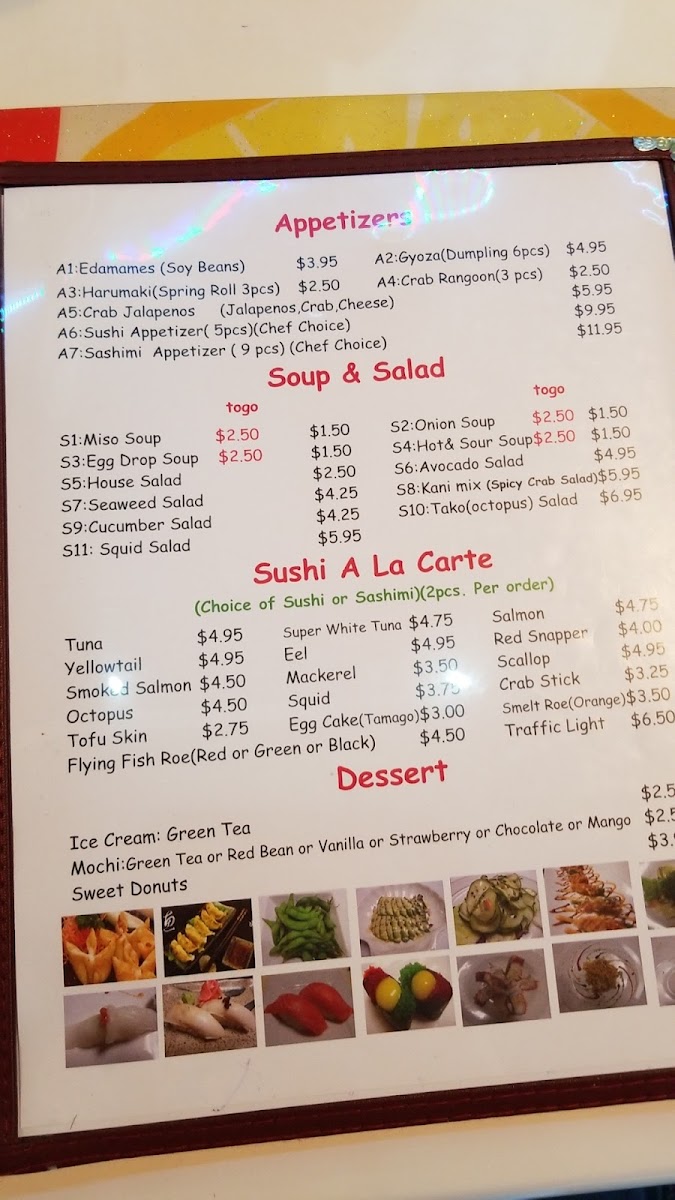 - Soup & Salad: Various soups and salads such as Miso Soup (available for takeout), House Salad, Seaweed Salad, Squid Salad, Tako (Octopus) Salad, and Avocado Salad. These provide lighter options to complement the main dishes or as starters.