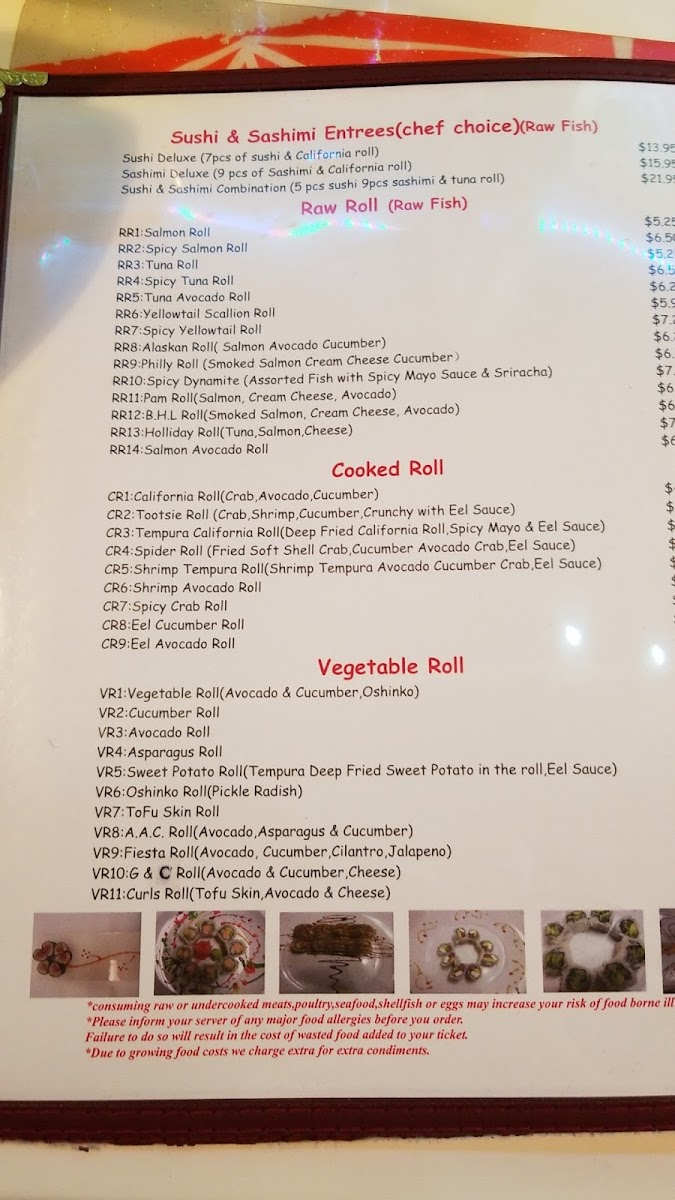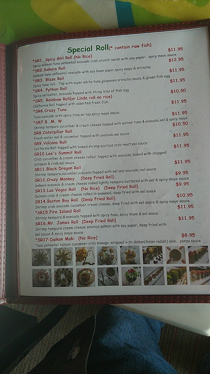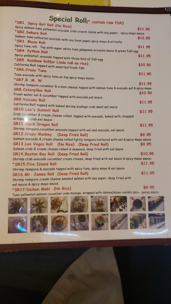 - Sushi Rolls: A selection of classic and specialty sushi rolls including options such as the Volcano Roll, Rainbow Roll, Shrimp Tempura Roll, and other unique creations like the Lee’s Summit Roll and American Dream Roll.